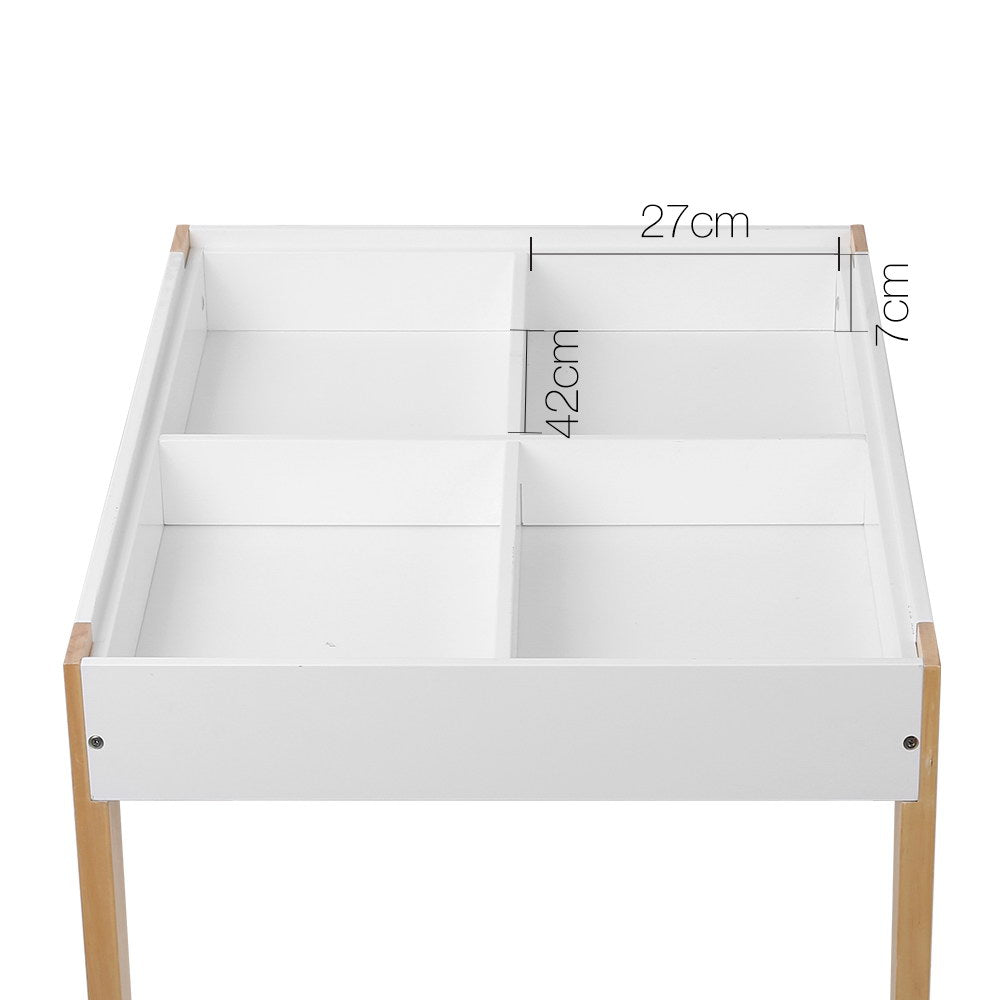 Made from eco-friendly MDF board and Pine wood, the entire ensemble is designed to last and be child-safe with non-toxic white paint, round corners and smooth edges. But best of all, the Table top can be converted from a normal table to a chalkboard desk in minutes. Simply lift up each half of the table and turn them over. It’s convenient and opens up a new avenue for your children to draw, scribble and doodle to their heart’s content. Better still, beneath the table are four compartments for easy storage of books, stationery and craft materials that your child may require from time to time.