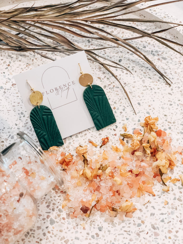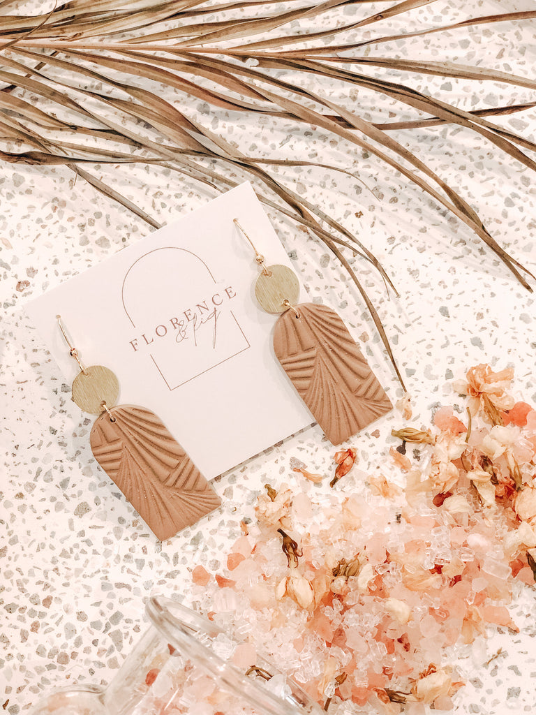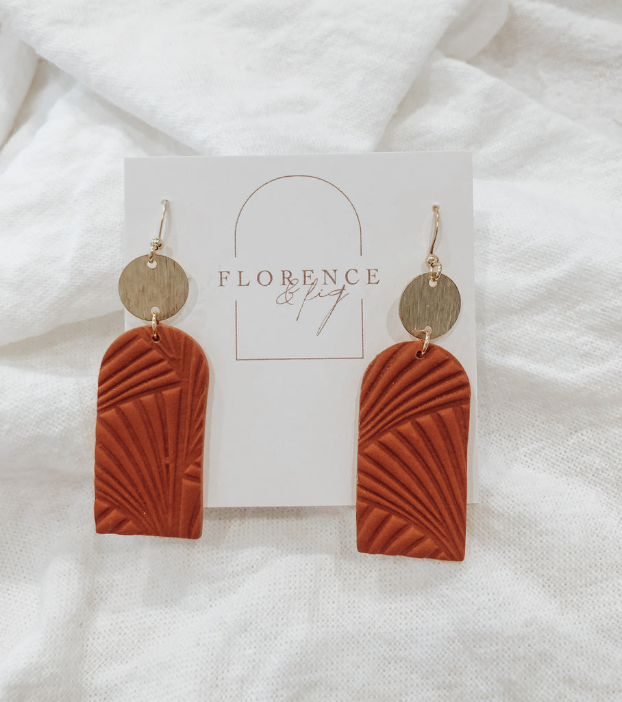 - Florence & Fig - Long Textured Chic Arch with Brass Detail earrings - Available in Terracotta, Emerald & Fawn.