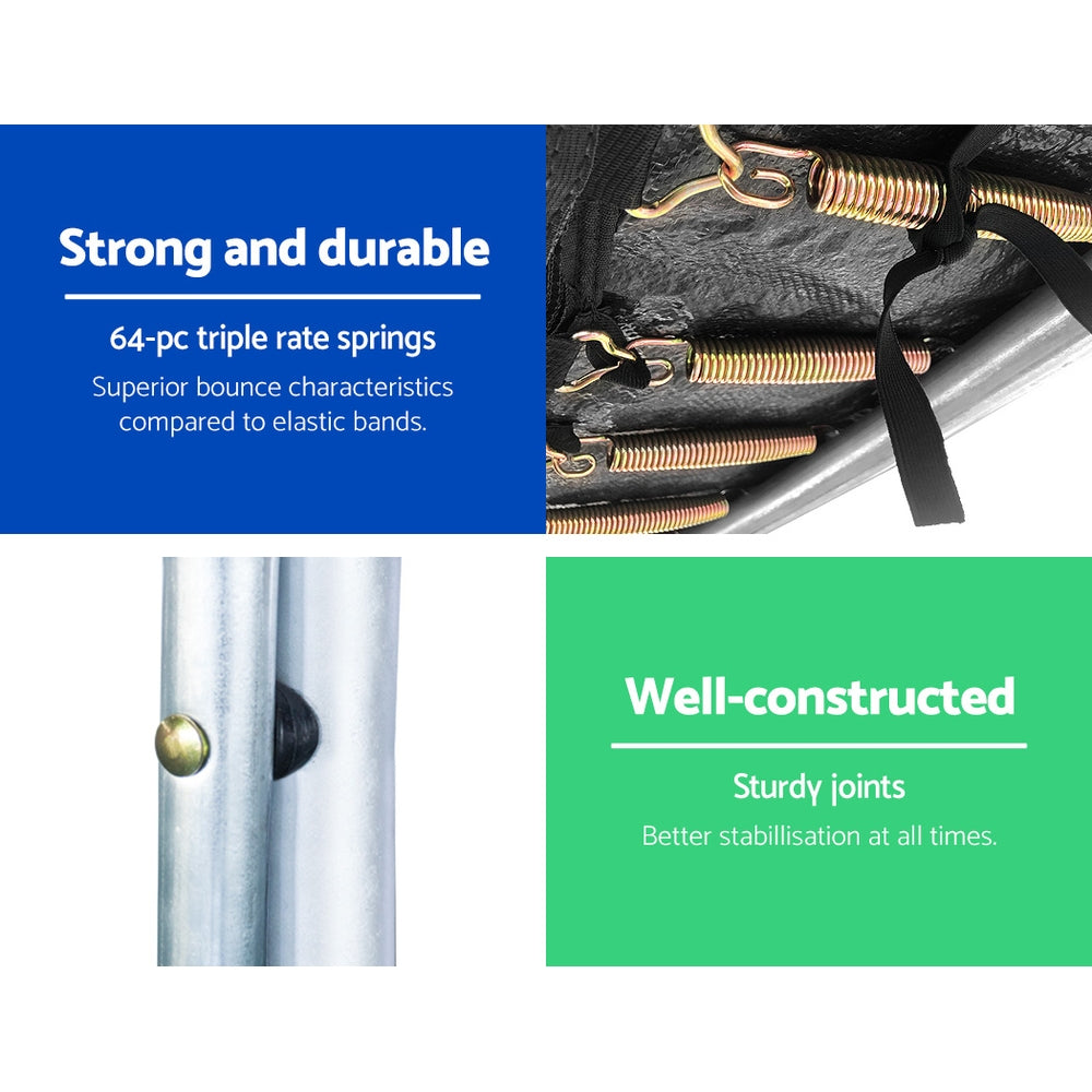 Bounce to your heart’s content with the Trampoline. With its superior bounce characteristics featuring 64-piece triple rate springs, the 10-foot Trampoline enables safe and durable bouncing with no worries. The heavy-gauge steel framework is designed to handle all robust play and is UV-tested for quality and reliability. Other great features include a curve design for more rigidness, 20mm thick padding, anti-graze mat, safety netting and a double-lock zip-and-clip entry. Not least, the included basketball hoop, basketball and pump really adds an awesome fun factor to the entire ensemble. So jump to it and order the Trampoline today.