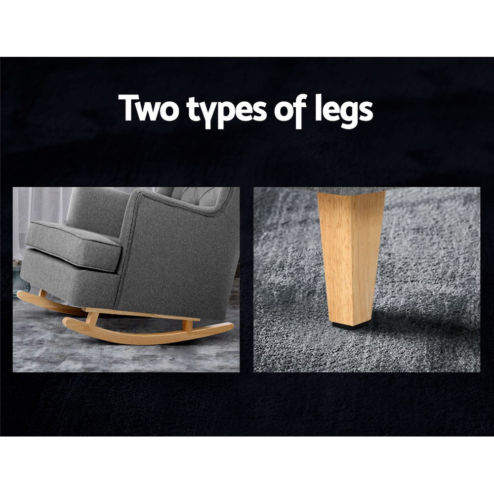 Be swayed. Rock on and relax with our Gaia Rocking Chair. It comes with two sets of removable legs so that you can use it as a rocking chair or a stationary chair. The gentle swaying of the rocking chair would be perfect for reading, listening to music, taking a much-needed nap, or even rocking your baby to sleep. Or simply swap the legs over and you have a classic accent chair. The iconic design and the tufted wingback exude elegance and timeless appeal. This makes the chair suitable for any décor, from your living room to your nursery. The extra thick foam padding and wide back ensure ultimate comfort with exceptional support. The armchair feet are fitted with pads to keep your floors pristine from scratches and damage. Together with a reinforced wooden frame and quality linen fabric upholstery, our armchair is guaranteed to stand up to durable use for many years to come.