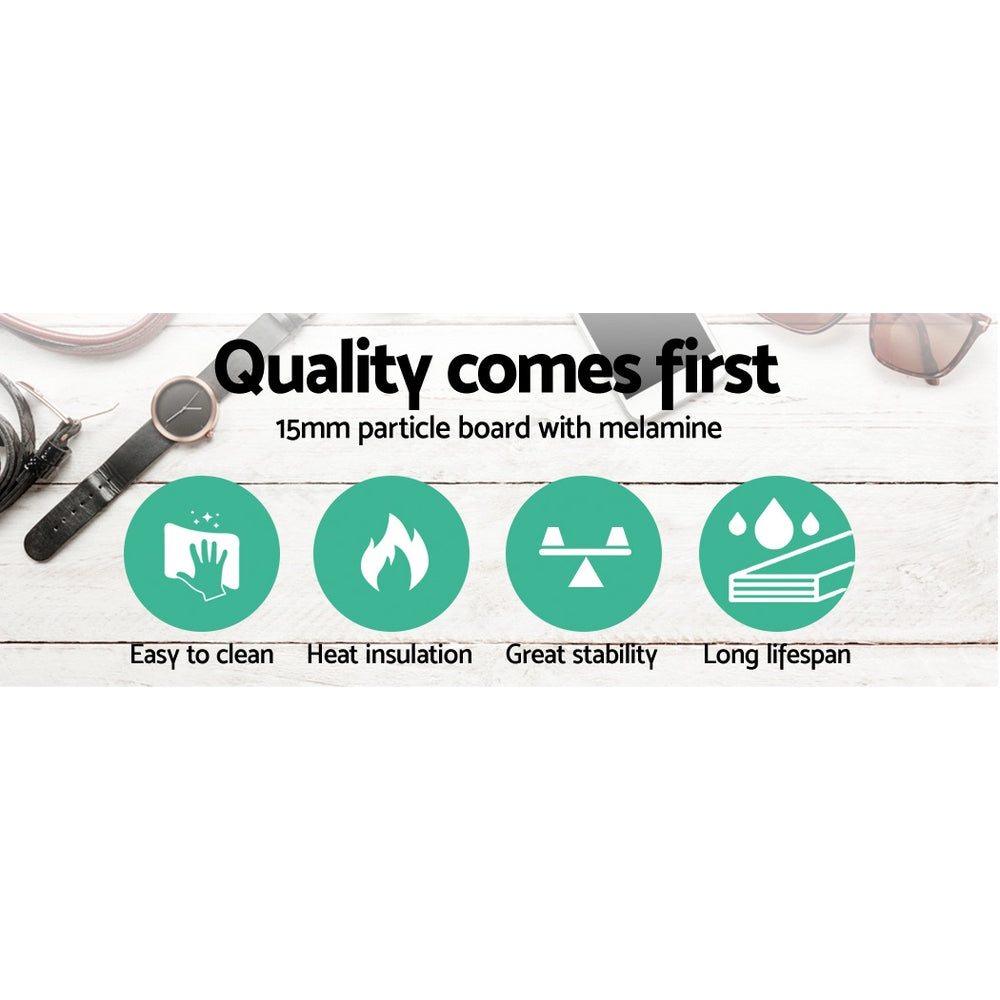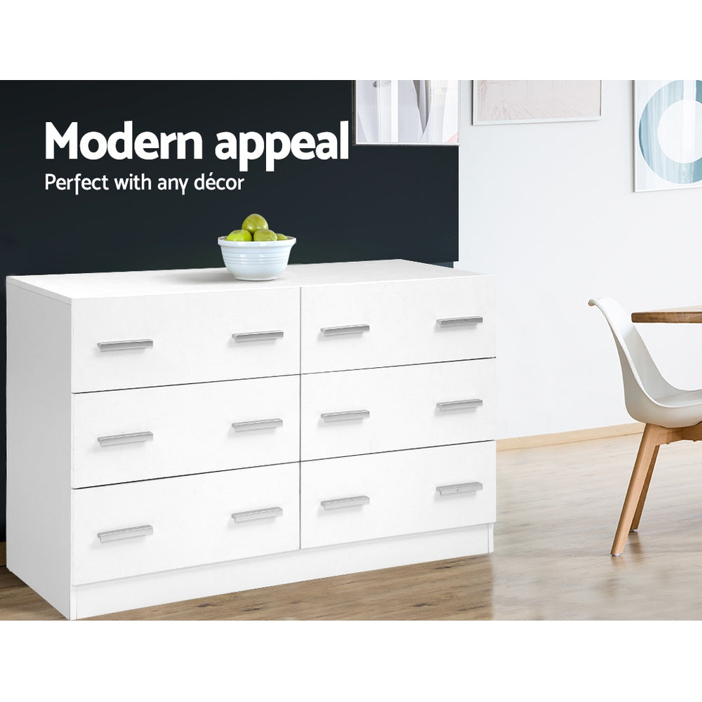 Practical and handsome, our Artiss 6-drawer Lowboy is perfect for those looking for extra storage space for your home. Contemporary and simply designed, this beauty features a flawless melamine finish with elegant aluminium handles that will easily match your home décor. Made with premium 15mm thick particle board with anti-rust coated drawer runners, our lowboy works ever so smoothly with minimum hassle. Not least, it provides plenty of storage space with six generous-sized drawers for all your clothing, fashion essentials and more.